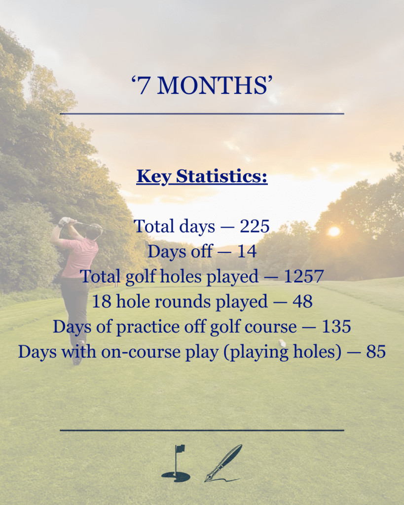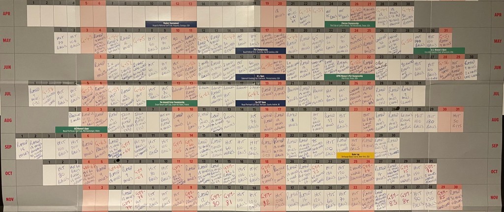 As many of you may know, I have recently kept a wall chart to keep a track of my daily practice habits. This was to keep me accountable; to provide evidence that I was ‘putting in the necessary work’; to use as research for my own golf and to apply to my coaching; and most importantly, to improve my golf. I have filled in my wall chart for over 7 months without fail. I recently crossed the 7-month mark at the end of November. I now feel like 7 months of solid work is a comprehensive enough ‘sample size’ and body of work, to draw some findings and conclusions. I have spent the last few weeks reflecting on the period of time, deciding on what I could pass onto others that might be in a similar position or just to those who want to get better.